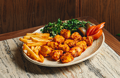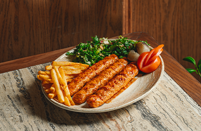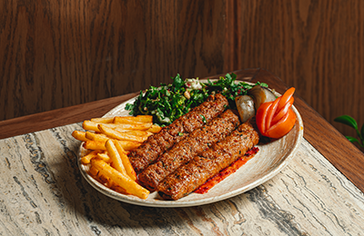 ثلاثة أسياخ من كباب اللحم الطري، متبّلة بتوابل خاصة ومشوية على الفحم، تُقدّم مع بطاطا مقلية، خضار مشوية، وصوص جانبي