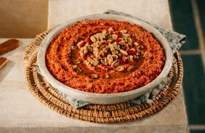 مزيج من الجوز المحمص المطحون و الفلفل الأحمر المشوي مع دبس الرمان، ممزوجة بزيت الزيتون